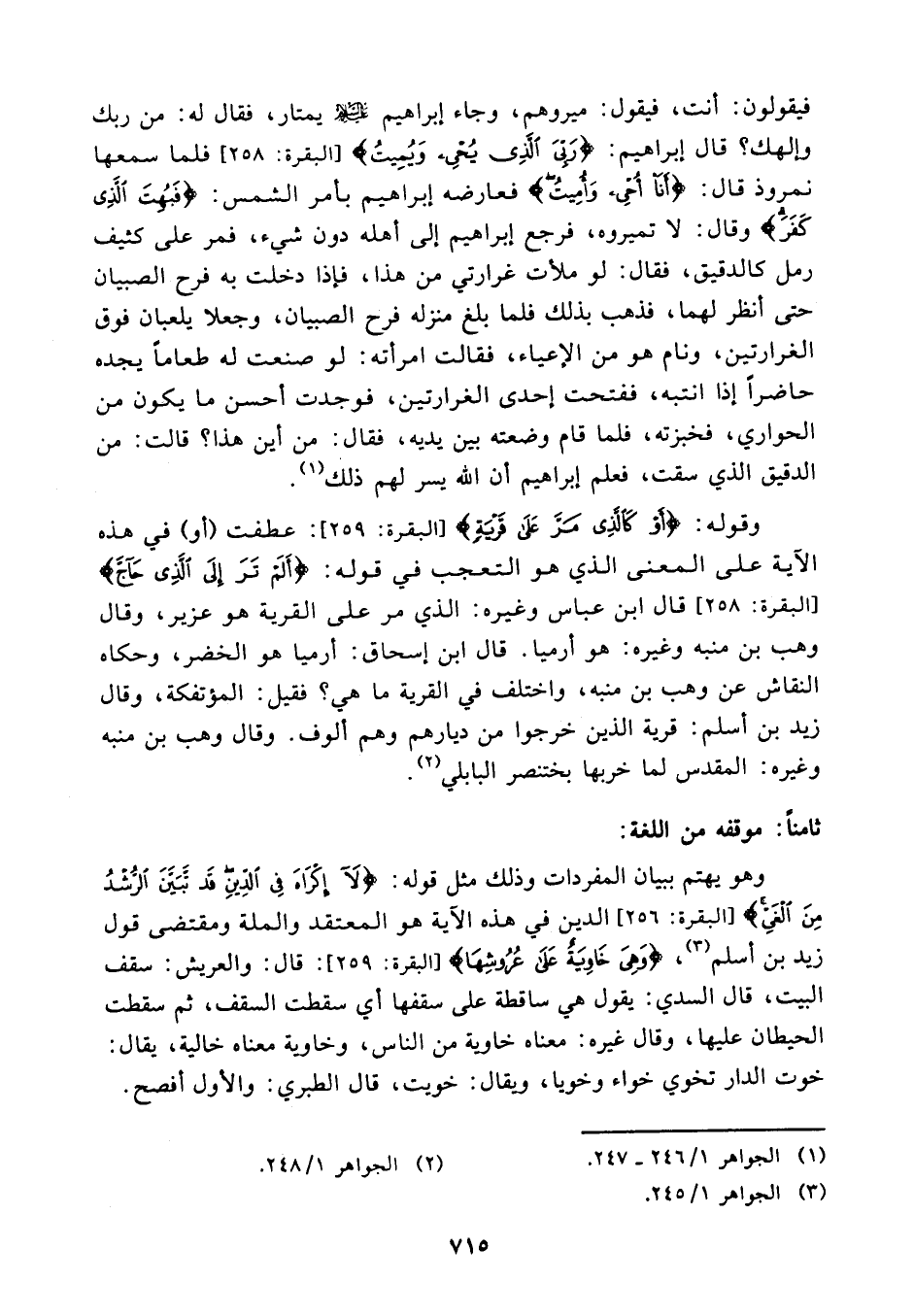 عطفت (أو) في هذه الآية على المعنى الذي هو التعجب في قوله: {ألم تر إلى الذي حاج} (¬4) قال ابن عباس وغيره: الذي مر على القرية هو عزير، وقال وهب بن منبه وغيره: هو أرميا. قال ابن إسحاق: أرميا هو الخضر، وحكاه النقاش عن وهب بن منبه، واختلف في القرية ماهي؟ فقيل: المؤتفكة، وقال زيد بن أسلم: قرية الذين خرجوا من ديارهم وهم ألوف. وقال وهب بن منبه وغيره: المقدس لما خربها بختنصر البابلي. (¬5)