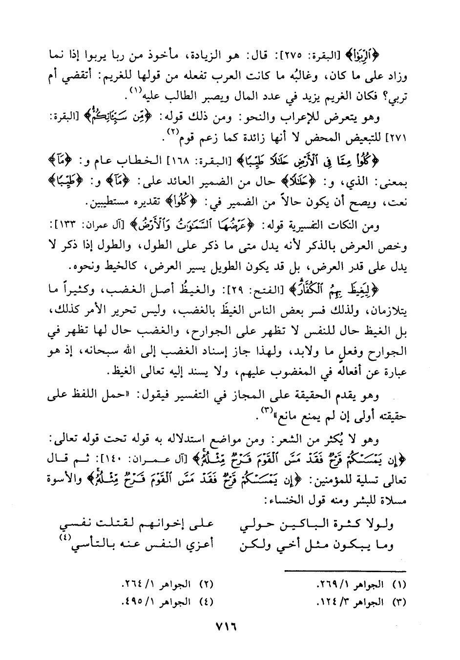 وهو يقدم الحقيقة على المجاز في التفسير فيقول: " حمل اللفظ على حقيقته أولى إن لم يمنع مانع " (¬8)