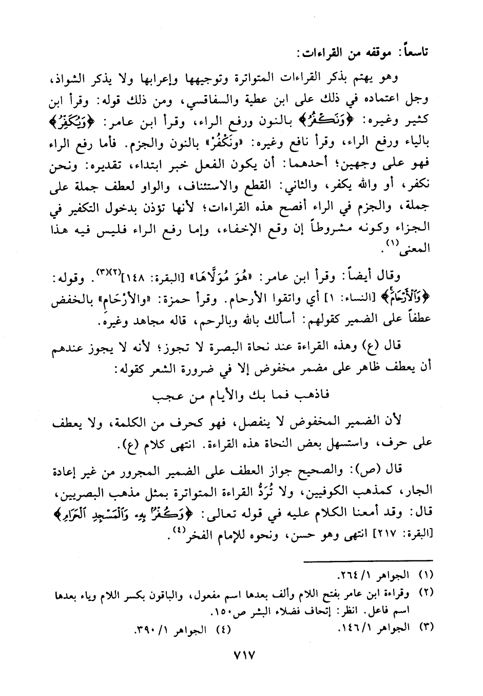 قال (ص:): والصحيح جواز العطف على الضمير المجرور من غير إعادة الجار، كمذهب الكوفيين، ولاترد القراءة المتواترة بمثل مذهب البصريين، قال: وقد أمعنا الكلام عليه في قوله تعالى: {وكفر به والمسجد الحرام} (¬5) انتهى وهو حسن، ونحوه للإمام الفخر. (¬6)