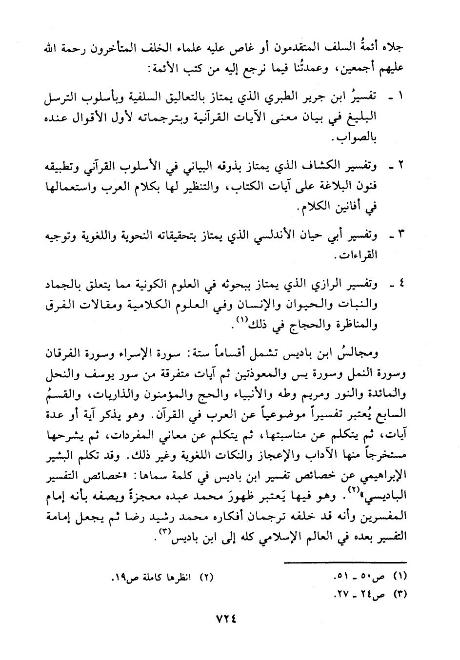 وقد تكلم البشير الإبراهيمي عن خصائص تفسير ابن باديس في كلمة سماها "خصائص التفسير الباديسي" انظرها كاملة. (¬2) وهو فيها يعتبر ظهور محمد عبده معجزة ويصفه بأنه إمام المفسرين وأنه قد خلفه ترجمان أفكاره محمد رشيد رضا ثم يجعل إمامة التفسير بعده في العالم الإسلامي كله إلى ابن باديس. (¬3)