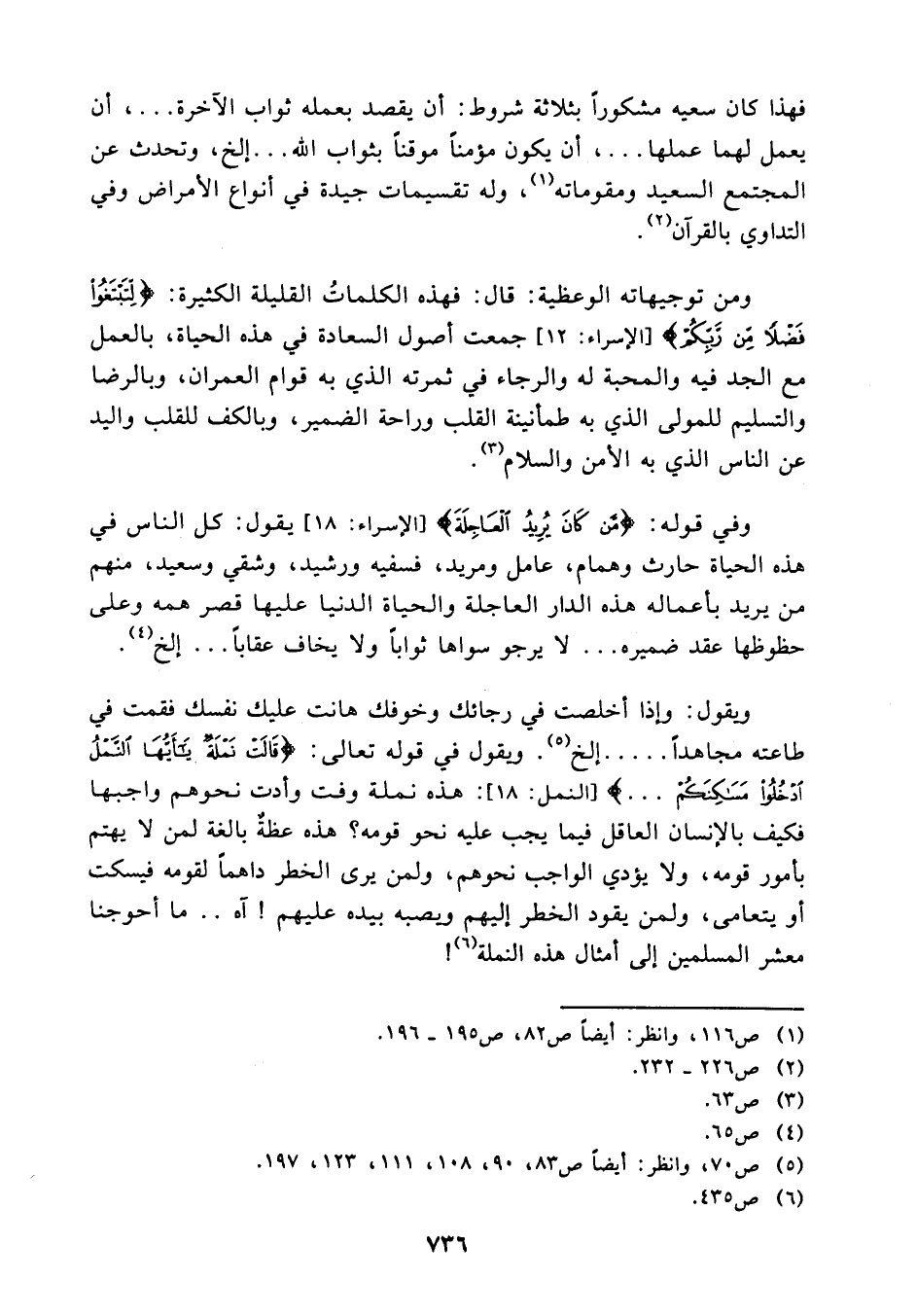 قال: فهذه الكلمات القليلة الكثيرة {لتبتغوا فضلا من ربكم} (¬3) جمعت أصول السعادة في هذه الحياة، بالعمل مع الجد فيه والمحبة له والرجاء في ثمرته الذي به قوام العمران وبالرضا والتسليم للمولى الذي به طمأنينة القلب وراحة الضمير وبالكف للقلب واليد عن الناس الذي به الأمن والسلام (¬4).