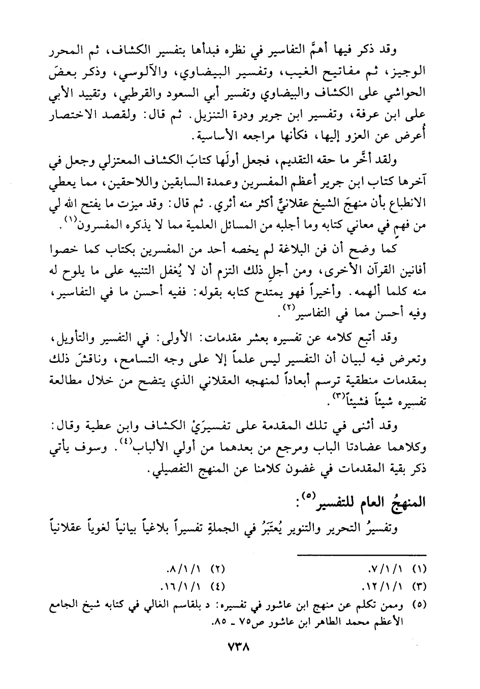 (¬5) وممن تكلم عن منهج ابن عاشور في تفسيره: د بلقاسم الغالي في كتابه شيخ الجامع الأعظم محمد الطاهر ابن عاشور ص: 75 - 85.