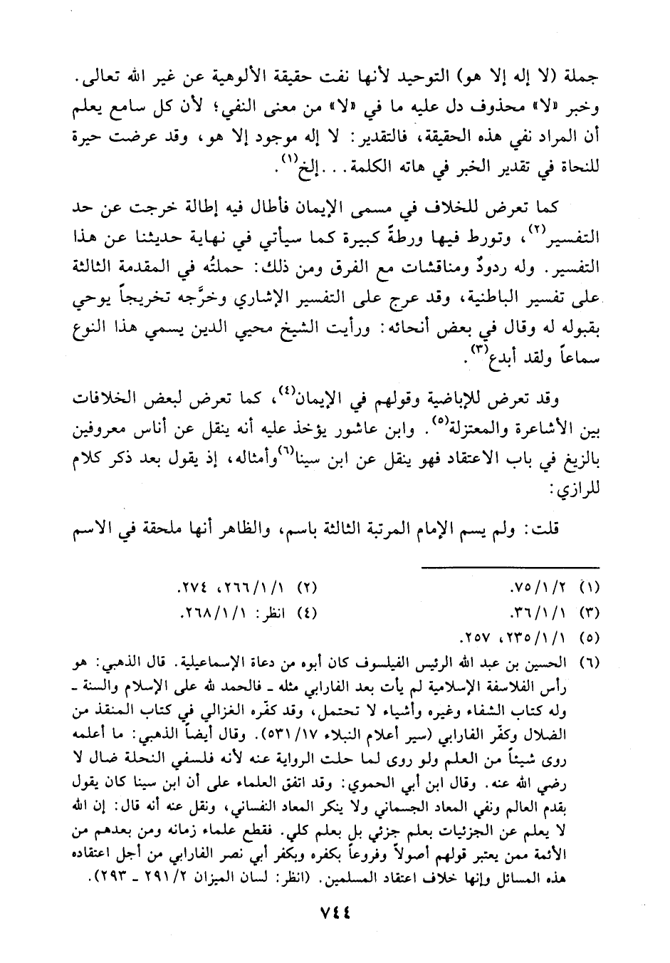 (¬6) الحسين بن عبد الله الرئيس الفيلسوف كان أبوه من دعاة الإسماعيلية قال الذهبي: هو رأس الفلاسفة الإسلامية لم يأت بعد الفارابي مثله فالحمد لله على الإسلام والسنة وله كتاب الشفاء وغيره وأشياء لاتحتمل وقد كفره الغزالي في كتاب المنقذ من الضلال وكفر الفارابي (سير أعلام النبلاء 17/ 531) وقال أيضا الذهبي: ماأعلمه روى شيئا من العلم ولو روى لماحلت الرواية عنه لأنه فلسفي النحلة ضال لارضي الله عنه. وقال ابن أبي الحموي: وقد اتفق العلماء على أن ابن سينا كان يقول بقدم العالم ونفي المعاد الجسماني ولا ينكر الميعاد النفساني ونقل عنه أنه قال: إن الله لا يعلم عن الجزئيات بعلم جزئي بل بعلم كلي فقطع علماء زمانه ومن بعدهم من الأئمة ممن يعتبر قولهم أصولا وفروعا بكفره وبكفر أبي نصر الفارابي من أجل اعتقاده هذه المسائل وإنها حلاف إعتقاد المسلمين. (انظر لسان الميزان 2/ 291 - 293).