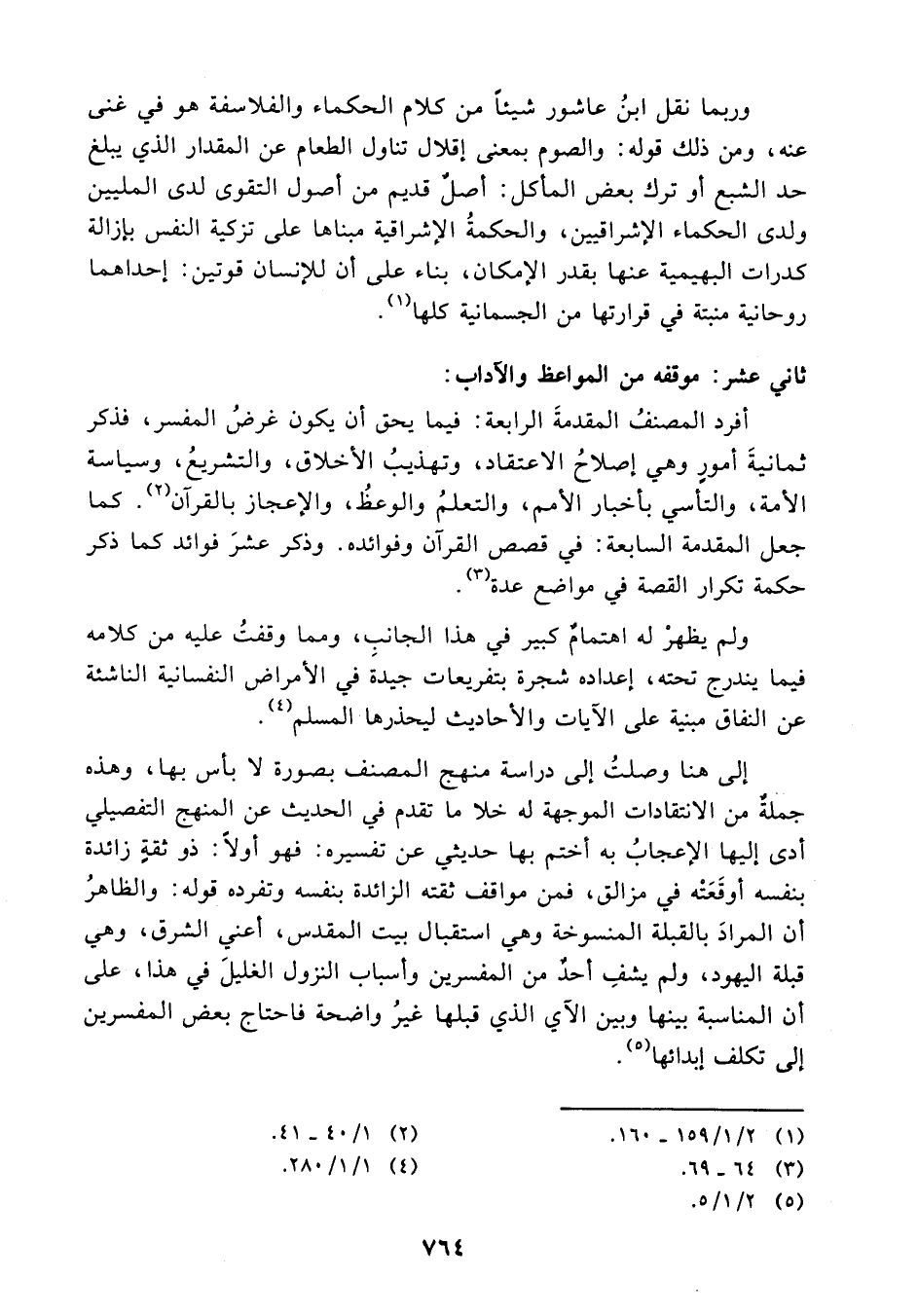 وربما نقل ابن عاشور شيئا من كلام الحكماء والفلاسفة هو في غنى عنه ومن ذلك قوله: