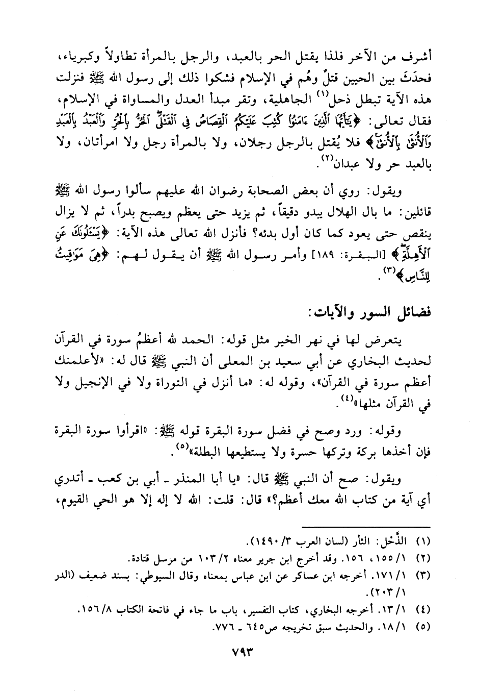 أشرف من الآخر فلذا يقتل الحر بالعبد، والرجل بالمرأة تطاولا وكبرياء فحدث بين الحيين قتل وهم في الإسلام فشكوا ذلك إلى رسول الله - صلى الله عليه وسلم - فنزلت هذه الآية تبطل ذحل (¬1) الجاهلية، وتقر مبدأ العدل والمساواة في الإسلام فقال تعالى {يا أيها الذين آمنوا كتب عليكم القصاص في القتلى الحر بالحر والعبد بالعبد والأنثى بالأنثى} فلا يقتل بالرجل رجلان، ولا بالمرأة رجل ولا امرأتان، ولا بالعبد حر ولا عبدان. (¬2)