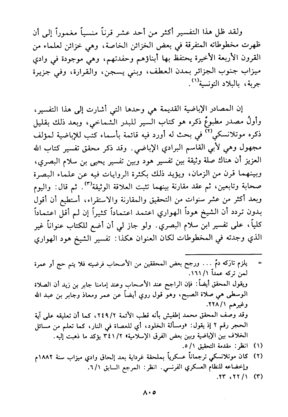 ثم قال: واليوم وبعد أكثر من عشر سنوات من التحقيق والمقارنة والاستقراء، أستطيع أن أقول بدون تردد أن الشيخ هودًا الهواري اعتمد اعتمادًا كثيرا إن لم أقل اعتمادًا كليا، على تفسير ابن سلام البصري. ولو جاز لي أن أضع للكتاب عنوانًا غير الذي وجدته في المخطوطات لكان العنوان هكذا: تفسير الشيخ هود الهواري