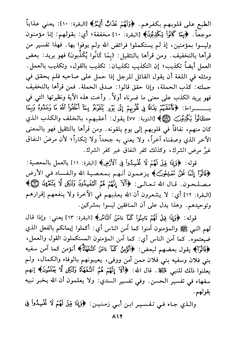 الطبع على قلوبهم بكفرهم. {ولهم عذاب أليم}: يعني عذابًا موجعا. {بما كانوا يكذبون} مخففة؛ أي: بقولهم: إنا مؤمنون وليسوا بمؤمنين إذ لم يستكملوا فرائض الله ولم يوفوا بها. فهذا تفسير من قرأها بالتخفيف. ومن قرأها بالتثقيل: {بما كانوا يُكَذِّبون} فهو يريد: بعض العمل أيضًا تكذيب؛ إن التكذيب تكذيبان: تكذيب بالقول، وتكذيب بالعمل. ومثله في اللغة أن يقول القائل للرجل إذا حمل على صاحبه فلم يحقق في حملته: كذب الحملة، وإذا حقق قالوا: صدق الحملة. فمن قرأها بالتخفيف فهو يريد الكذب على معنى ما فسرناه أولا. وأخت هذه الآية ونظيرتها التي في براءة: {فأعقبهم نفاقًا في قلوبهم إلى يوم يلقونه بما أخلفوا الله ما وعدوه وبما كانوا يكذبون} (¬1) يقول: أعقبهم، بالخلف والكذب الذي كان منهم، نفاقًا في قلوبهم إلى يوم يلقونه. ومن قرأها بالتثقيل فهو بالمعنى الآخر الذي وصفناه آخرًا، ولا يعني به جحدًا ولا إنكارا، لأن مرض النفاق غير مرض الشرك، وكذلك كفر النفاق غير كفر الشرك.
