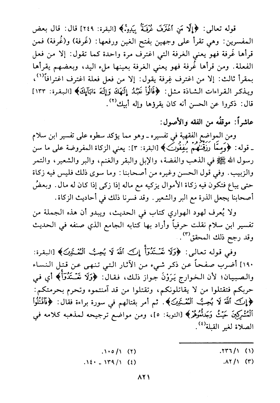 ومن المواضع الفقهية في تفسيره - وهو مما يؤكد سطوه على تفسير ابن سلام - قوله: {ومما رزقناهم ينفقون} (¬5) يعني الزكاة المفروضة على ما سن رسول الله - صلى الله عليه وسلم - في الذهب والفضة، والإبل والبقر والغنم، والبر والشعير، والتمر والزبيب. وفي قول الحسن وغيره من أصحابنا: وما سوى ذلك فليس فيه زكاة حتى يباع فتكون فيه زكاة الأموال يزكيه مع ماله إذا زكى إذا كان له مال. وبعض أصحابنا يجعل الذرة مع البر والشعير. وقد فسرنا ذلك في أحاديث الزكاة.