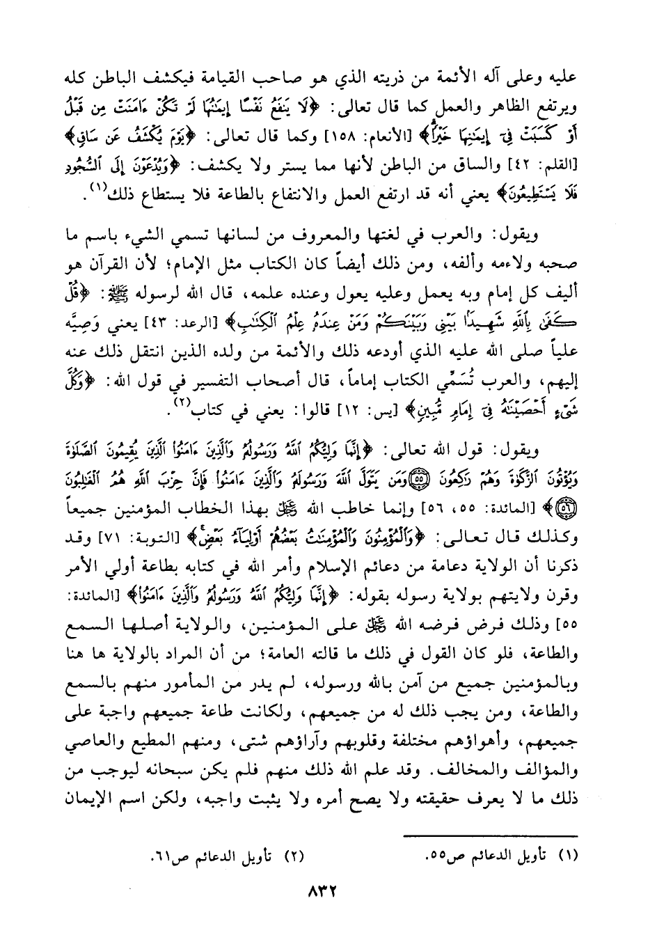 قول الله تعالى: {إنما وليكم الله ورسوله والذين آمنوا الذين يقيمون الصلاة ويؤتون الزكاة وهم راكعون ومن يتول الله ورسوله والذين آمنوا فإن حزب الله هم الغالبون} (¬7) وإنما خاطب الله عز وجل بهذا الخطاب المؤمنين جميعا وكذلك قال تعالى {والمؤمنون والمؤمنات بعضهم أولياء بعض} (¬8) وقد ذكرنا أن الولاية دعامة من دعائم الإسلام وأمر الله في كتابه بطاعة أولي الأمر وقرن ولايتهم بولاية رسوله بقوله: {إنما وليكم الله ورسوله والذين آمنوا} (¬9) وذلك فرض فرضه الله عز وجل على المؤمنين، والولاية أصلها السمع والطاعة، فلو كان القول في ذلك ما قالته العامة؛ من أن المراد بالولاية ها هنا وبالمؤمنين جميع من آمن بالله ورسوله، لم يدر من المأمور منهم بالسمع والطاعة، ومن يجب ذلك له من جميعهم، ولكانت طاعة جميعهم واجبة على جميعهم، وأهواؤهم مختلفة وقلوبهم وآراؤهم شتى، ومنهم المطيع والعاصي والمؤالف والمخالف.