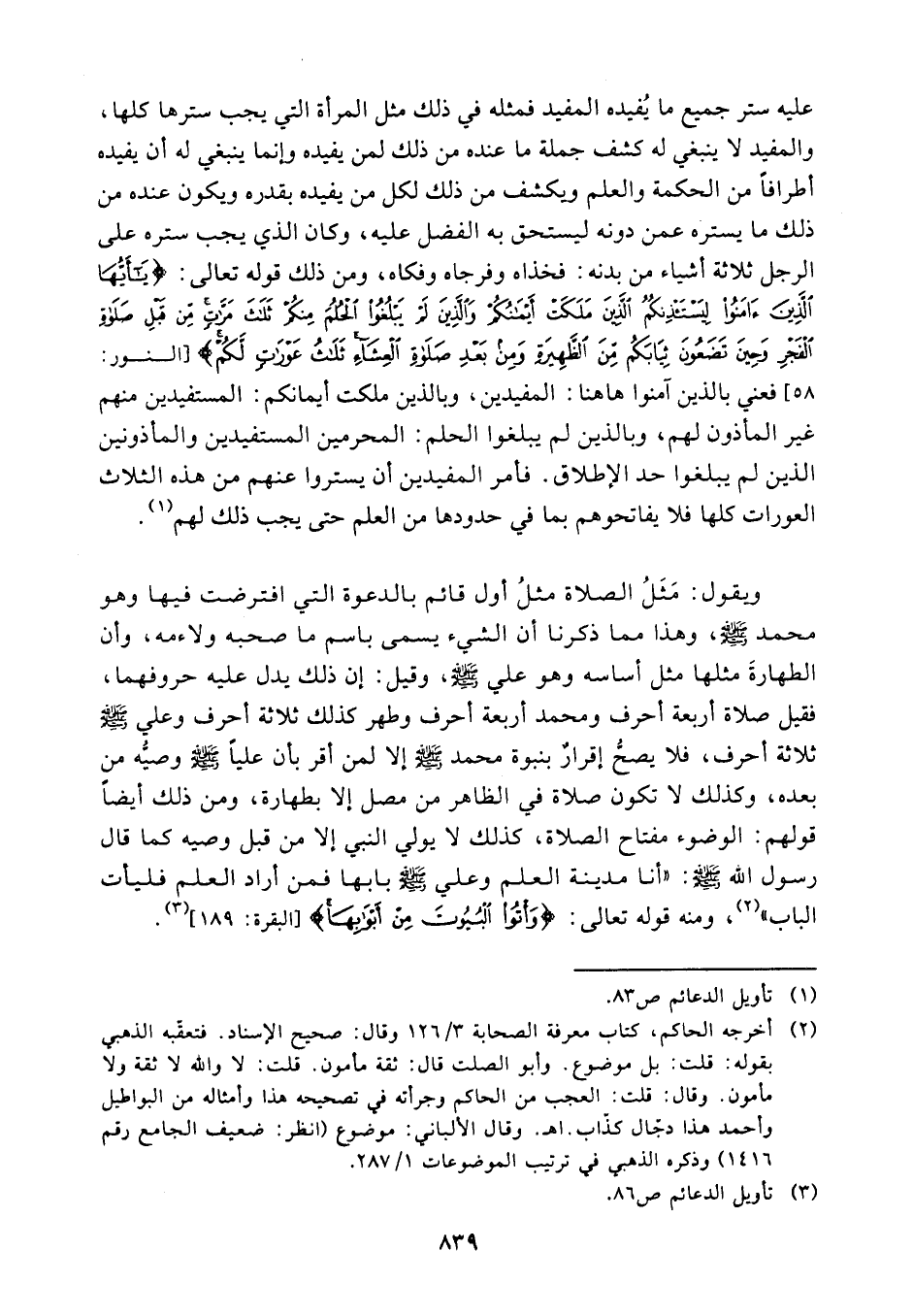 مثل الصلاة مثل أول قائم بالدعوة التي افترضت فيها وهو محمد - صلى الله عليه وسلم - وهذا مما ذكرنا أن الشيء يسمى باسم ماصحبه ولاءمه وأن الطهارة مثلها مثل أساسه وهو علي - صلى الله عليه وسلم - وقيل إن ذلك يدل عليه حروفهما فقيل صلاة أربعة أحرف ومحمد أربعة أحرف وطهر كذلك ثلاثة أحرف وعلي - صلى الله عليه وسلم - ثلاثة أحرف فلا يصح إقرار بنبوة محمد - صلى الله عليه وسلم - إلا لمن أقر بأن عليا - صلى الله عليه وسلم - وصيه من بعده وكذلك لا تكون صلاة في الظاهر من مصل إلا بطهارة ومن ذلك أيضا قولهم الوضوء مفتاح الصلاة كذلك لا يولي النبي إلا من قبل وصيه كما قال رسول الله - صلى الله عليه وسلم -: "أنا مدينة العلم وعلي - صلى الله عليه وسلم - بابها فمن أراد العلم فليأت الباب" (¬3) ومنه قوله تعالى: {وأتوا البيوت من أبوابها} (¬4) ... (¬5)