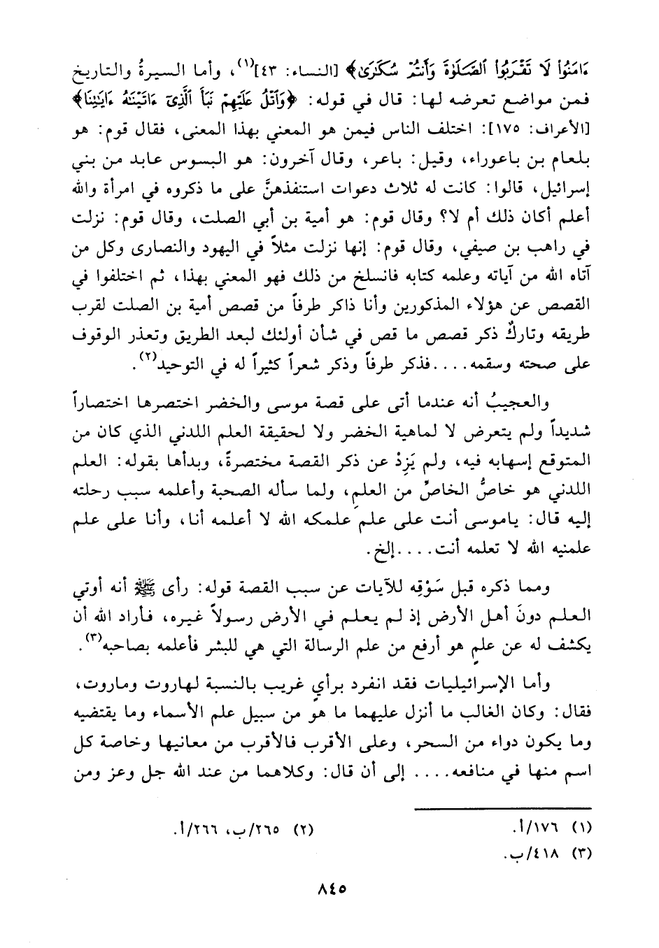 والعجيب أنه عندما أتى على قصة موسى والخضر اختصرها اختصارا شديدا ولم يتعرض لا لماهية الخضر ولا لحقيقة العلم اللدني الذي كان من المتوقع إسهابه فيه ولم يزد عن ذكر القصة مختصرة وبدأها بقوله: العلم اللدني هو خاص الخاص من العلم ولما سأله الصحبة وأعلمه سبب رحلته إليه قال ياموسى أنت على علم ملكه الله لا أعلمه أنا وأنا على علم علمنيه الله لا تعلمه أنت ... .الخ