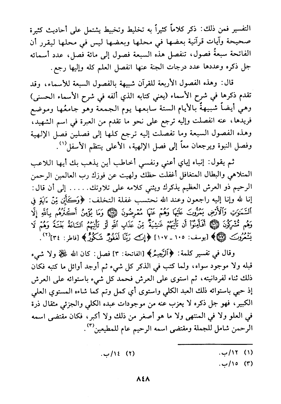 ذكر كلاما كثيرا به تخليط وتخبيط يشتمل على أحاديث كثيرة صحيحة وآيات قرآنية بعضها في محلها وبعضها ليس في محلها ليقرر أن الفاتحة سبعة فصول تنفصل هذه السبعة فصول إلى مائة فصل عدد أسمائه جل ذكره وعددها عدد درجات الجنة عنها انفصل العلم كله وإليها رجع.