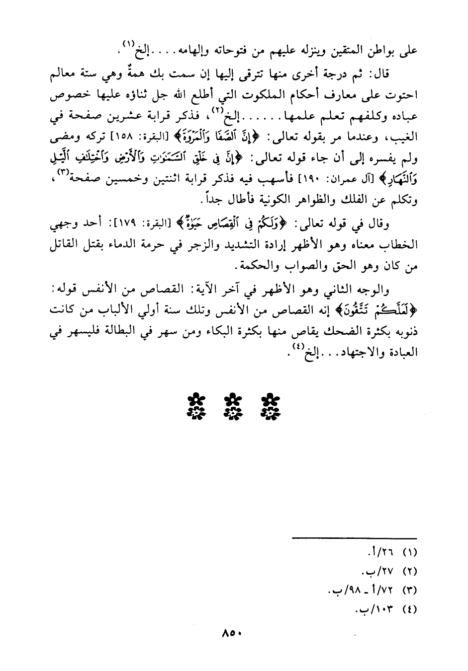 وعندما مر بقوله تعالى {إن الصفا والمروة} (¬3) تركه ومضى ولم يفسره إلى أن جاء قوله تعالى {إن في خلق السموات والأرض واختلاف الليل والنهار} (¬4) فأسهب فيه فذكر قرابة اثنتين وخمسين صفحة (¬5) وتكلم عن الفلك والظواهر الكونية فأطال جدا.