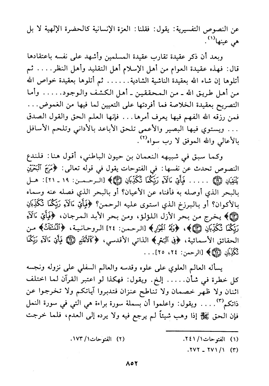 في الفتوحات يقول في قوله تعالى: {مرج البحرين يلتقيان ... .فبأي آلاء ربكما تكذبان} (¬3):