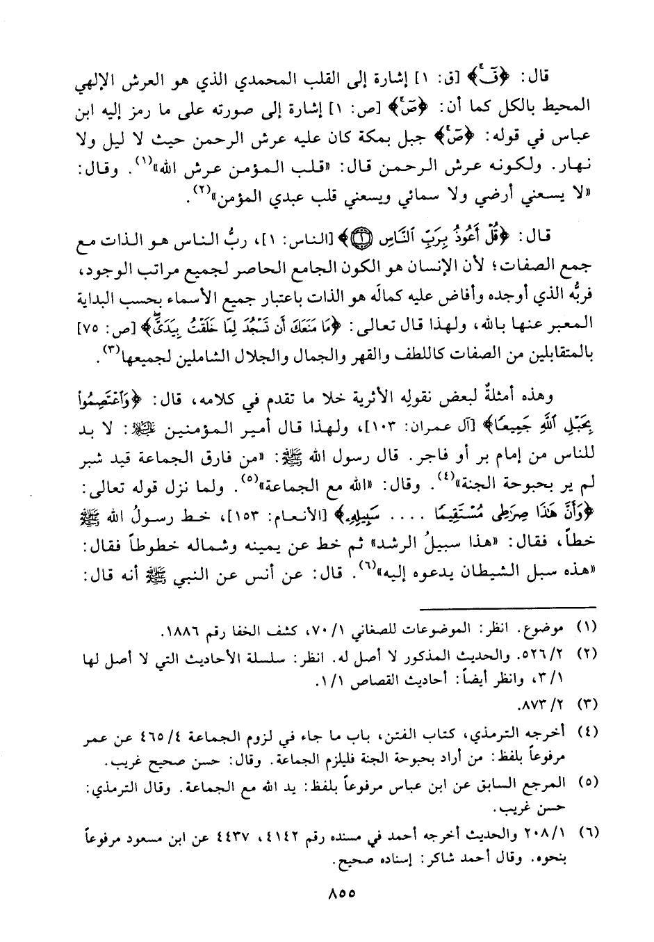 {ق:} (¬1) إشارة إلى القلب المحمدي الذي هو العرش الإلهي المحيط بالكل كما أن {ص:} (¬2) إشارة إلى صورته على مارمز إليه ابن عباس في قوله: {ص:} جبل بمكة كان عليه عرش الرحمن حيث لاليل ولا نهار. ولكونه عرش الرحمن قال: "قلب المؤمن عرش الله" (¬3). وقال: "لايسعني أرضي ولا سمائي ويسعني قلب عبدي