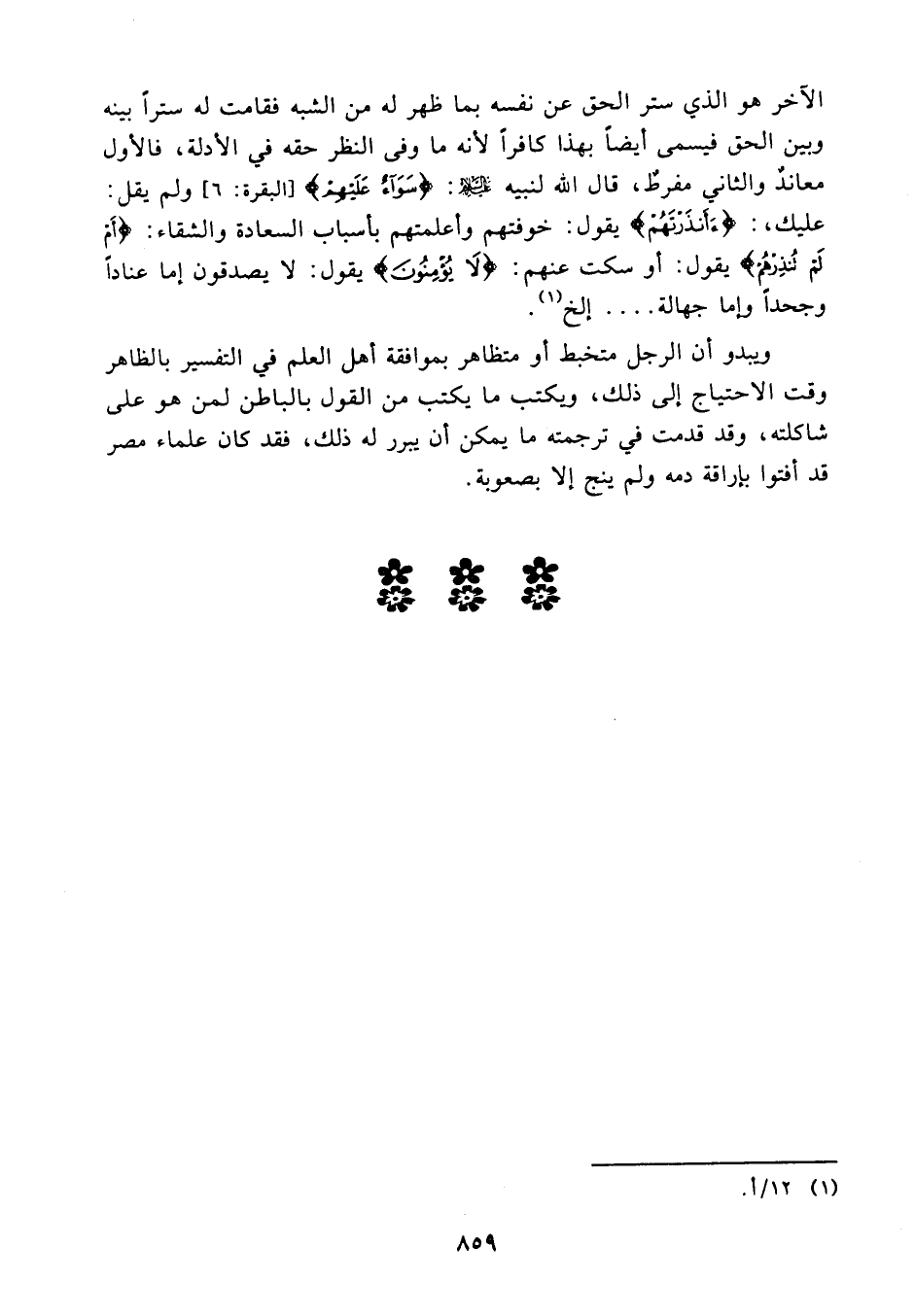 الآخر هو الذي ستر الحق عن نفسه بما ظهر له من الشبه فقامت له سترا بينه وبين الحق فيسمى أيضا بهذا كافرا لأنه ماوفى النظر حقه في الأدلة فالأول معاند والثاني مفرط قال الله لنبيه عليه السلام: {سواء عليهم} (¬1) ولم يقل: عليك، {ءأنذرتهم} يقول: خوفتهم وأعلمتهم بأسباب السعادة والشقاء {أم لم تنذرهم} يقول: أو سكت عنهم {لا يؤمنون} يقول: لا يصدقون إما عنادا وجحدا وإما جهالة ... . الخ (¬2)