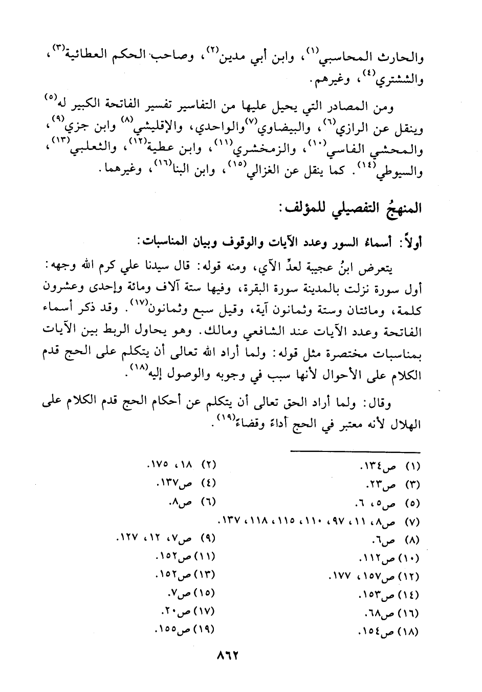 ومن المصادر التي يحيل عليها من التفاسير تفسير الفاتحة الكبير له (¬5) وينقل عن الرازي (¬6)، والبيضاوي (¬7) والواحدي والإقليشي (¬8) وابن جزي (¬9)، والمحشي الفاسي (¬10)، والزمخشري (¬11)، وابن عطية (¬12)، والثعلبي (¬13)، والسيوطي (¬14). كما ينقل عن الغزالي (¬15)، وابن البنا (¬16)، وغيرهما