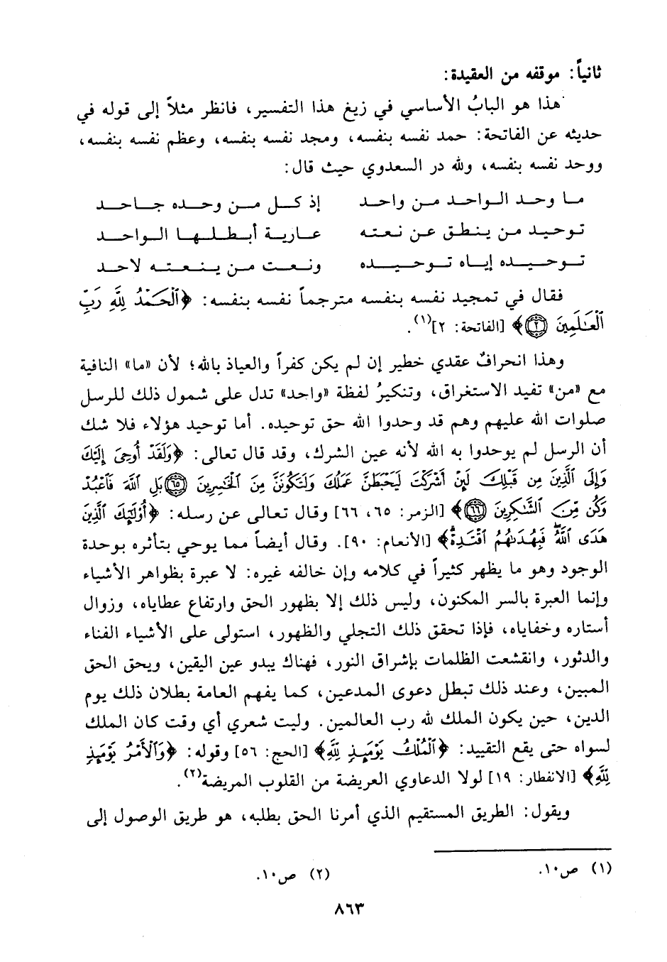 وهذا انحراف عقدي خطير إن لم يكن كفرا والعياذ بالله لأن "ما" النافية مع "من" تفيد الاستغراق وتنكير لفظة "واحد" تدل على شمول ذلك للرسل صلوات الله عليهم وهم قد وحدوا الله حق توحيده. أما توحيد هؤلاء فلاشك أن الرسل لم يوحدوا به الله لأنه عين الشرك وقد قال تعالى {ولقد أوحي إليك وإلى الذين من قبلك لئن أشركت ليحبطن عملك ولتكونن من الخاسرين بل الله فاعبد وكن من الشاكرين} (¬3) وقال تعالى عن رسله {أولئك الذين هدى الله فبهداهم اقتده} (¬4)