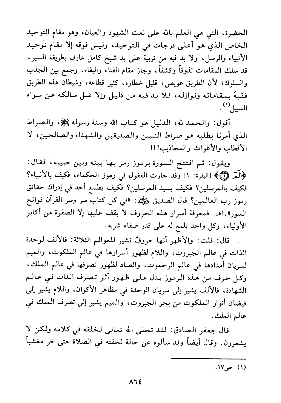 الحضرة، التي هي العلم بالله على نعت الشهود والعيان، وهو مقام التوحيد الخاص الذي هو أعلى درجات في التوحيد، وليس فوقه إلا مقام توحيد الأنبياء والرسل، ولابد فيه من تربية على يد شيخ كامل عارف بطريقة السير، قد سلك المقامات تذوقا وكشفا، وجاز مقام الفناء والبقاء، وجمع بين الجذب والسلوك، لأن الطريق عويص، قليل خطاره، كثير قطاعه، وشيطان هذه الطريق فقيه بمقاماته ونوازله، فلا بد فيه من دليل وإلا ضل سالكه عن سواء السبيل. (¬1)