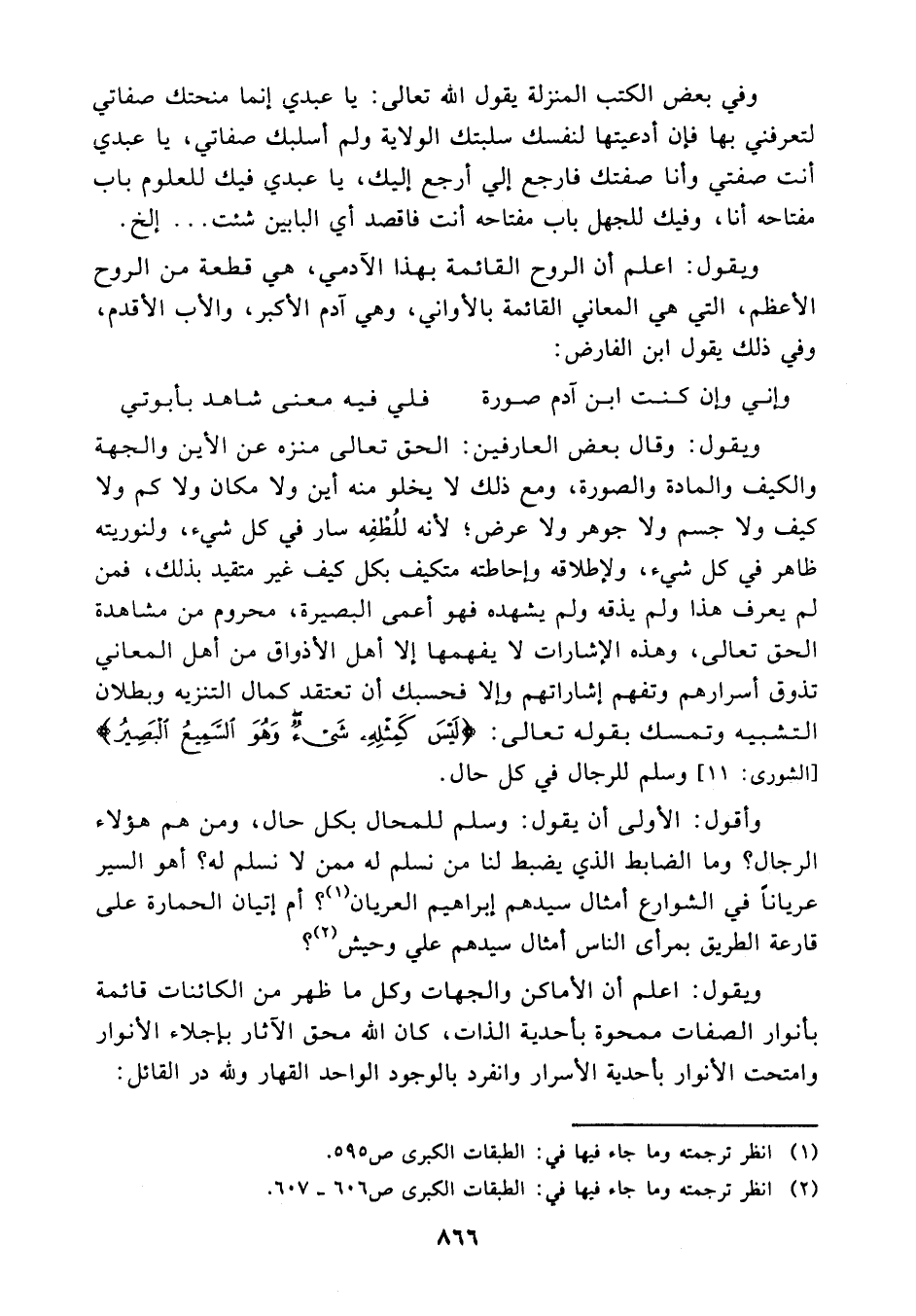 وهذه الإشارات لا يفهمها إلا أهل الأذواق من أهل المعاني تذوق أسرارهم وتفهم إشاراتهم وإلا فحسبك أن تعتقد كمال التنزيه وبطلان التشبيه وتمسك بقوله تعالى: {ليس كمثله شيء وهو السميع البصير} (¬1) وسلم للرجال في كل حال.