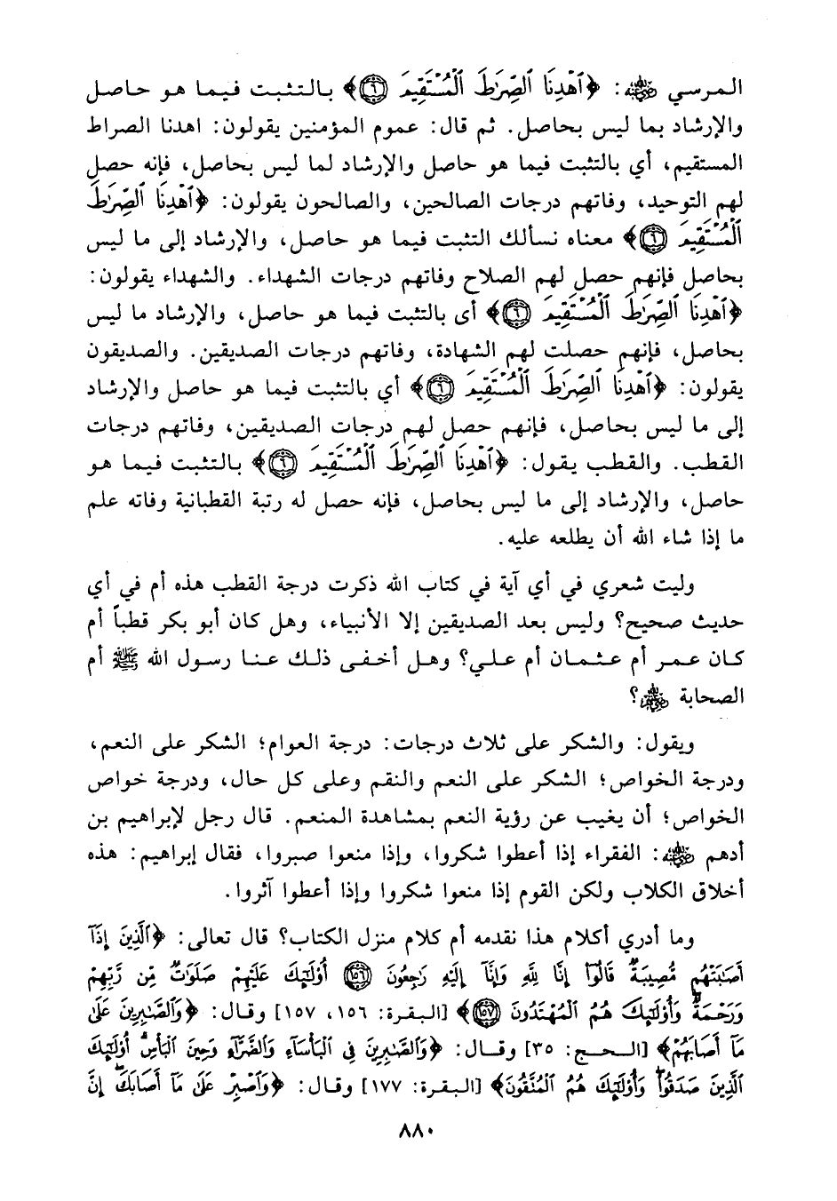 المرسي - رضي الله عنه -: {اهدنا الصراط المستقيم} بالتثبت فيما هو حاصل والإرشاد بما ليس بحاصل. ثم قال: عموم المؤمنين يقولون اهدنا الصراط المستقيم أي بالتثبت فيما هو حاصل والإرشاد لما ليس بحاصل، فإنه حصل لهم التوحيد، وفاتهم درجات الصالحين والصالحون يقولون: {اهدنا الصراط المستقيم} معناه نسألك التثبت فيما هو حاصل، والإرشاد إلى ماليس بحاصل فإنهم حصل لهم الصلاح وفاتهم درجات الشهداء. والشهداء يقولون: {اهدنا الصراط المستقيم} أى بالتثبت فيما هو حاصل، والإرشاد ماليس بحاصل، فإنهم حصلت لهم الشهادة، وفاتهم درجات الصديقين. والصديقون يقولون: {اهدنا الصراط المستقيم} أي بالتثبت فيما هو حاصل والإرشاد إلى ماليس بحاصل، فإنهم حصل لهم درجات الصديقين، وفاتهم درجات القطب. والقطب يقول: {اهدنا الصراط المستقيم} بالتثبت فيما هو حاصل، والإرشاد إلى ماليس بحاصل، فإنه حصل له رتبة القطبانية وفاته علم ما إذا شاء الله أن يطلعه عليه.
