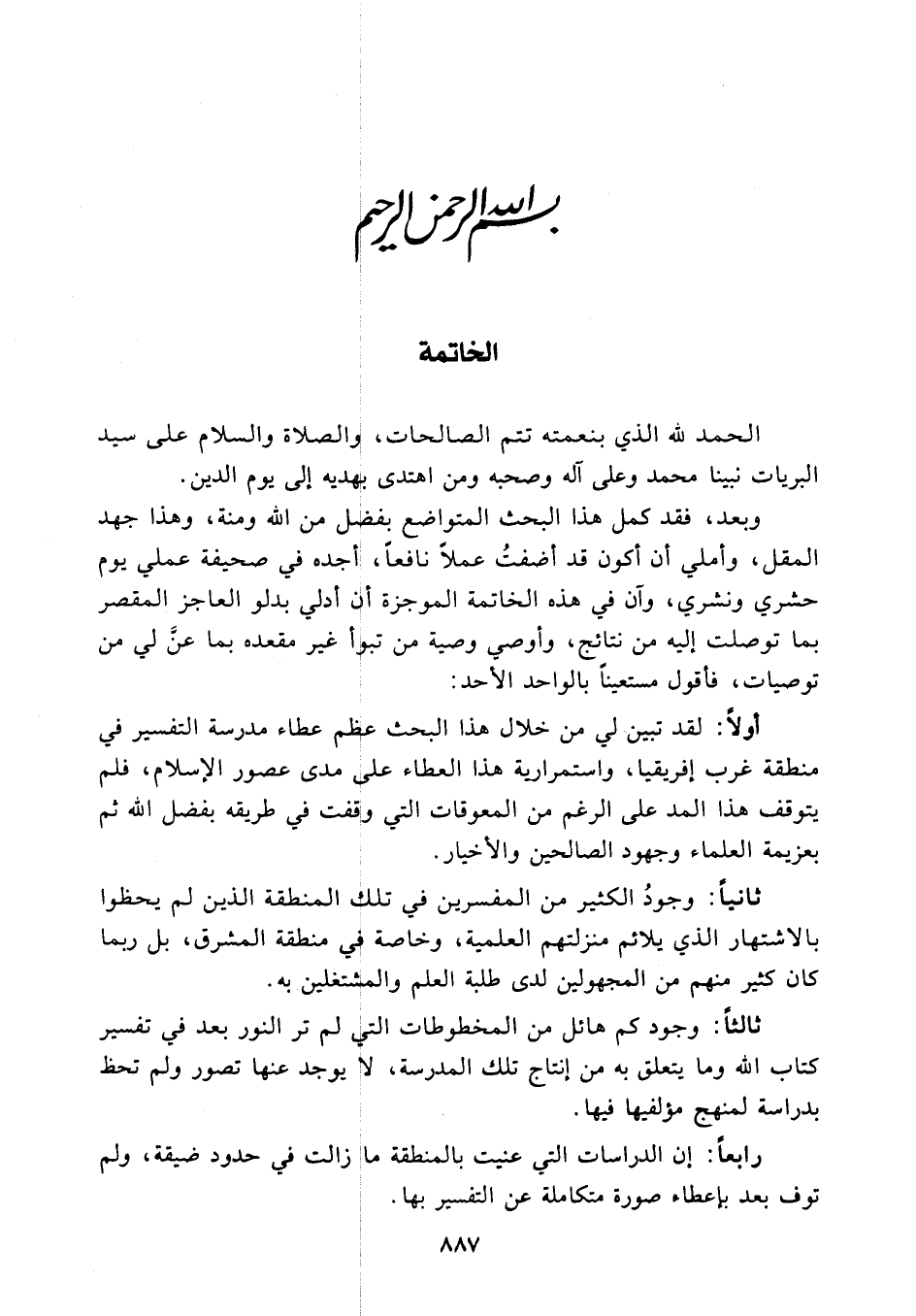 أولا: لقد تبين لي من خلال هذا البحث عظم عطاء مدرسة التفسير في منطقة غرب إفريقيا، واستمرارية هذا العطاء على مدى عصور الإسلام، فلم يتوقف هذا المد على الرغم من المعوقات التي وقفت في طريقه بفضل الله ثم بعزيمة العلماء وجهود الصالحين والأخيار.