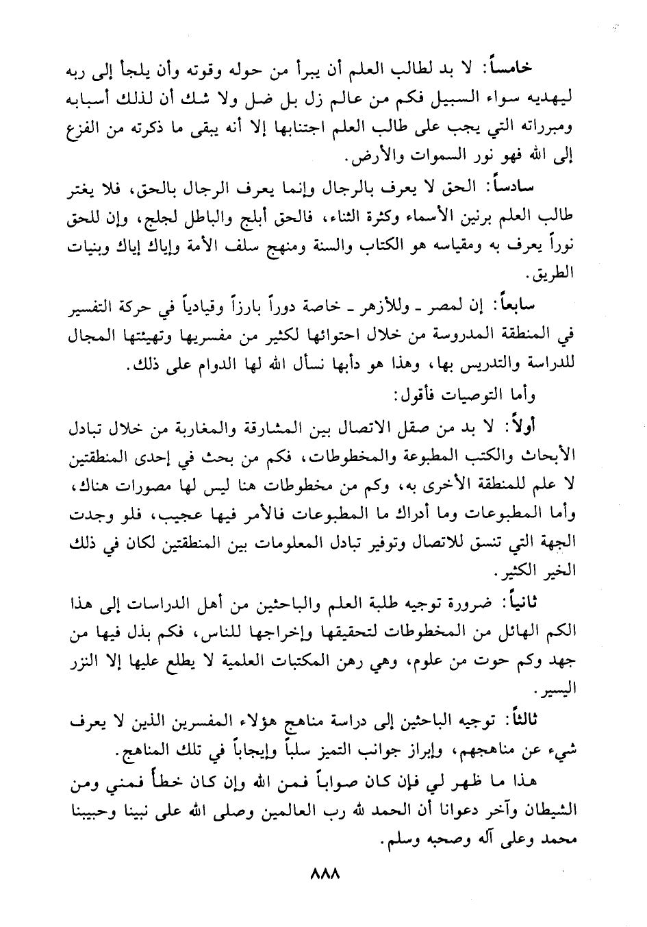 سابعا: إن لمصر - وللأزهر - خاصة دورا بارزا وقياديا في حركة التفسير في المنطقة المدروسة من خلال احتوائها لكثير من مفسريها وتهيئتها المجال للدراسة والتدريس بها، وهذا هو دأبها نسأل الله لها الدوام على ذلك.