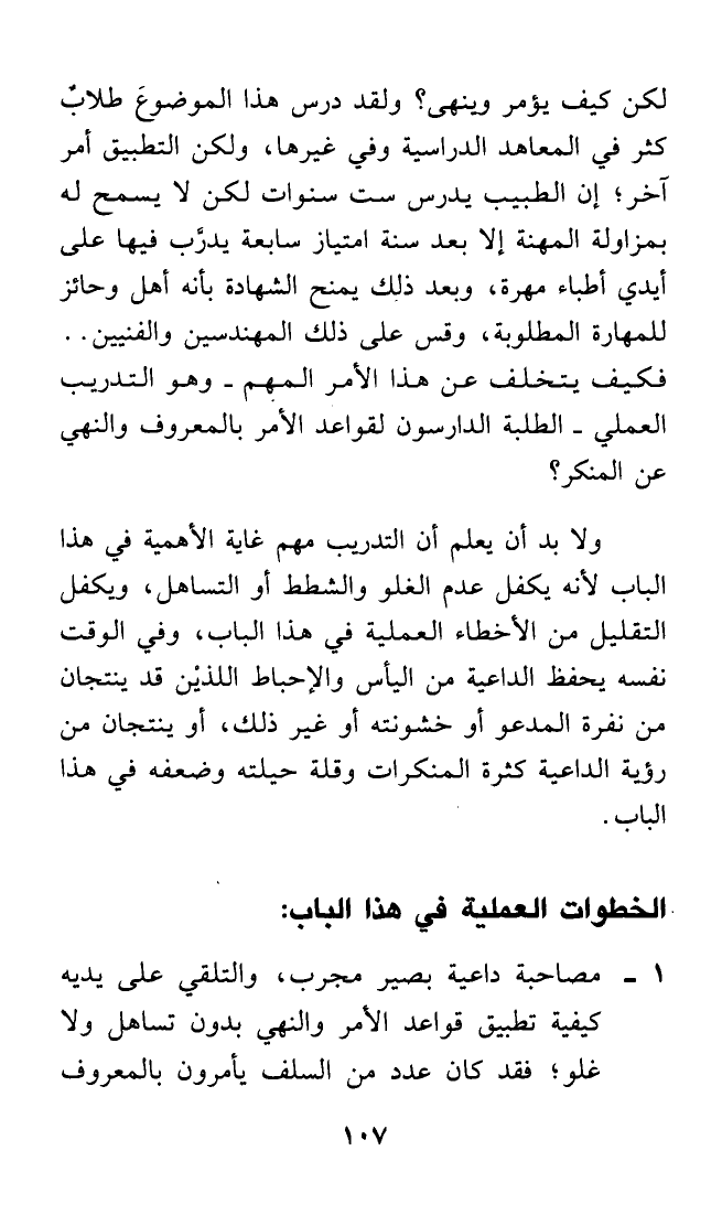 لكن كيف يؤمر وينهي؟ ولقد درس هذا الموضوعَ طلابٌ كثر في المعاهد الدراسية وفي غيرها، ولكن التطبيق أمر آخر؛ إن الطبيب يدرس ست سنوات لكن لا يسمح له مزاولة المهنة إلا بعد سنة امتياز سابعة يدرَّب فيها على أيدي أطباء مهرة، وبعد ذلك يمنح الشهادة بأنه أهل وحائز للمهارة المطلوبة، وقس على ذلك المهندسين والفنيين .. فكيف يتخلف عن هذا الأمر المهم - وهو التدريب العلمي - الطلبة الدارسون لقواعد الأمر بالمعروف والنهي عن المنكر؟