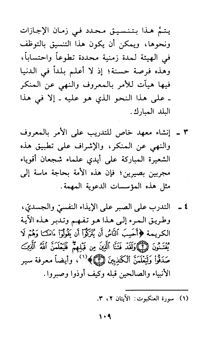 3 - إنشاء معهد خاص للتدريب على الأمر بالمعروف والنهي عن المنكر، والإشراف على تطبيق هذه الشعيرة المباركة على أيدي علماء شجعان أقوياء مجربين بصرين؛ فإن هذه الأمة بحاجة ماسة إلى مثل هذه المؤسسات الدعوية المهمة.
