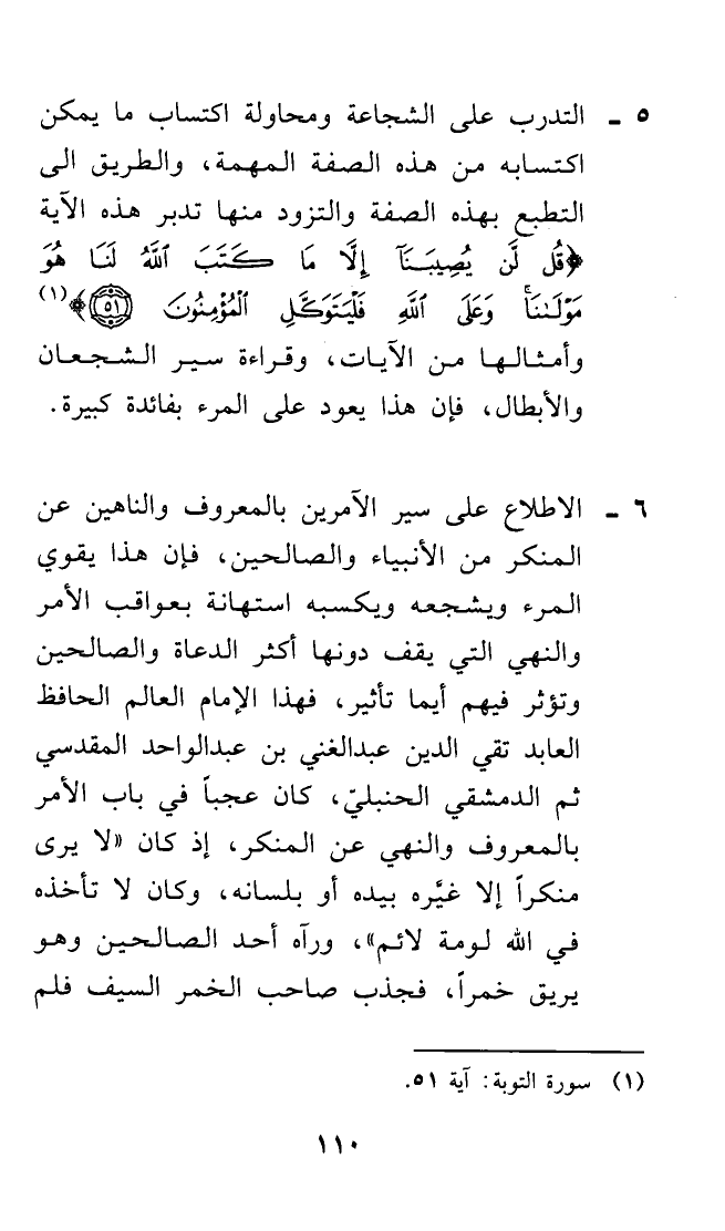 5 - التدرب على الشجاعة ومحاولة اكتساب ما يمكن اكتسابه من هذه الصفة المهمة، والطريق إلى التطبع بهذه الصفة والتزود منها تدبر هذه الآية (قل لن يصيبنا إلا ما كتب الله لنا هو مولانا وعلى الله فليتوكل المؤمنون) (¬1) وأمثالها من الآيات، وقراءة سير الشجعان والأبطال، فإن هذا يعود على المرء بفائدة كبيرة.
