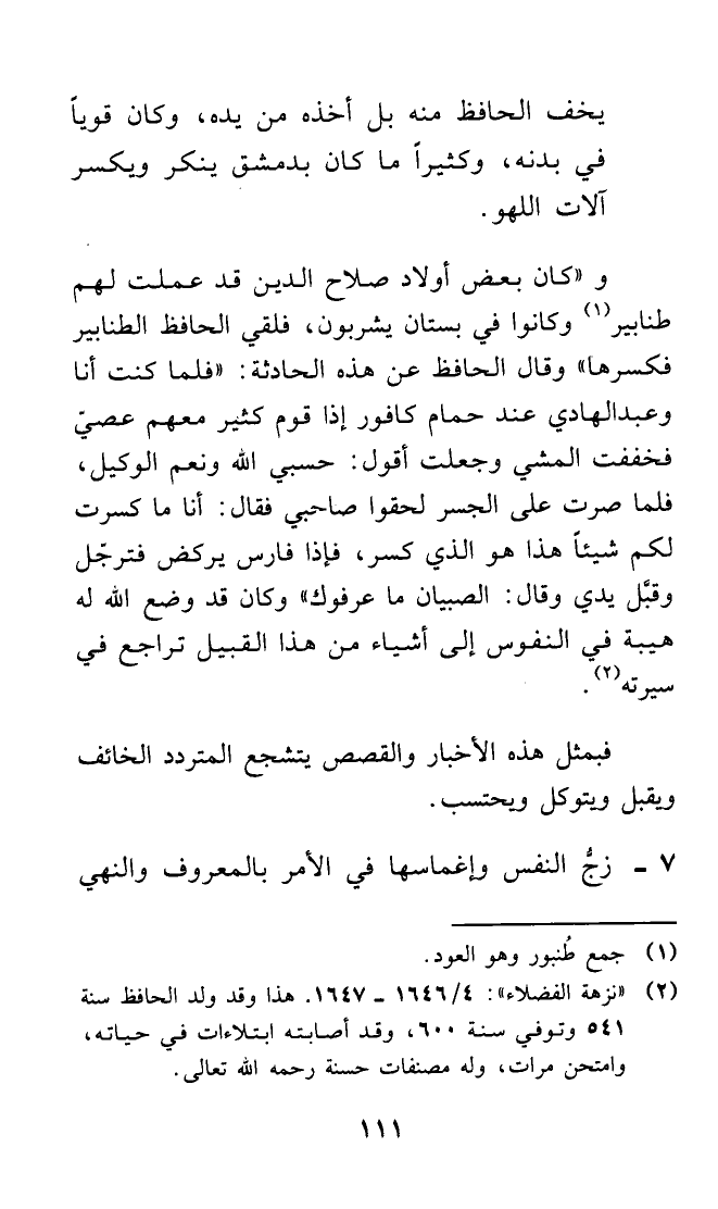 و ((كان بعض أولاد صلاح الدين قد عملت لهم طنابير (¬1) وكانوا في بستان يشربون، فلقي الحافظ الطنابير فكسرها)) وقال الحافظ عن هذه الحادثة: ((فلما كنت أنا وعبد الهادي عند حمام كافور إذا قوم كثير معهم عصيّ فخففت المشي وجعلت أقول: حسبي الله ونعم الوكيل، فلما صرت على الجسر لحقوا صاحبي فقال: إنا ما كسرت لكم شيئاً هذا هو الذي كسر، فإذا فارس يركض فترجّل وقبَّل يدي وقال: الصبيان ما عرفوك))
