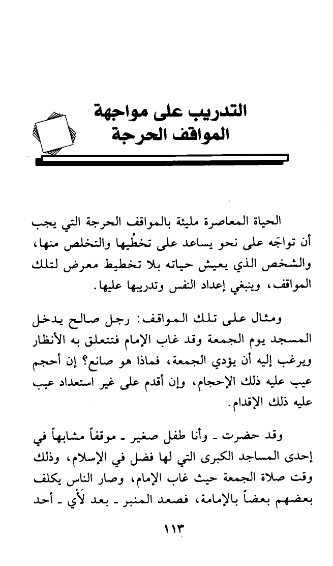 ومثال على تلك المواقف: رجل صالح يدخل المسجد يوم الجمعة وقد غاب الإمام فتتعلق به الأنظار ويرغب إليه أن يؤدي الجمعة، فماذا هو صانع؟ إن أحجم عيب عليه ذلك الإحجام، وإن أقدم على غير استعداد عيب عليه ذلك الإقدام.