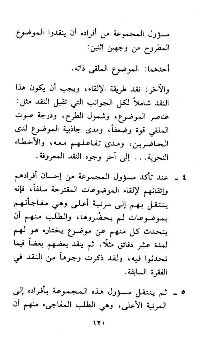 4 - عند تأكد مسؤول المجموعة من إحسان أفرادهم وإتقانهم لإلقاء الموضوعات المقترحة سلفاً، فإنه ينتقل بهم إلى مرتبة أعلى وهي مفاجأتهم بموضوعات لم يحضِّروها، والطلب منهم أن يتحدث كل منهم عن موضوع يختاره هو لهم لمدة عشر دقائق مثلاً، ثم ينقد بعضهم بعضاً فيما تحدثوا فيه، ولقد ذكرت وجوهاً من النقد في الفقرة السابقة.