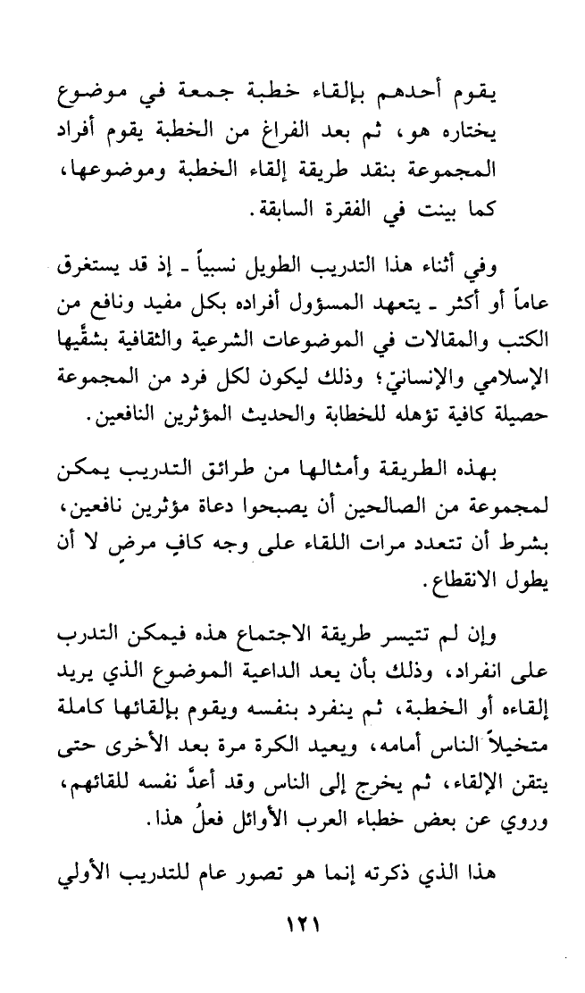 وفي أثناء هذا التدريب الطويل نسبياً - إذ قد يستغرق عاماً أو أكثر - يتعهد المسؤول أفراده بكل مفيد ونافع من الكتب والمقالات في الموضوعات الشرعية والثقافية بشقَّيها الإسلامي والإنسانيّ؛ وذلك ليكون لكل فرد من المجموعة حصيلة كافية تؤهله للخطابة والحديث المؤثرين النافعين.
