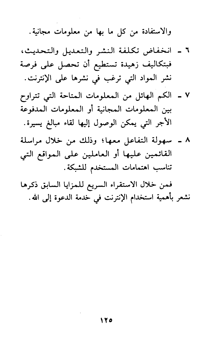 8 - سهولة التفاعل معها؛ وذلك من خلال مراسلة القائمين عله أو العاملين على المواقع التي تناسب اهتمامات المستخدم للشبكة.