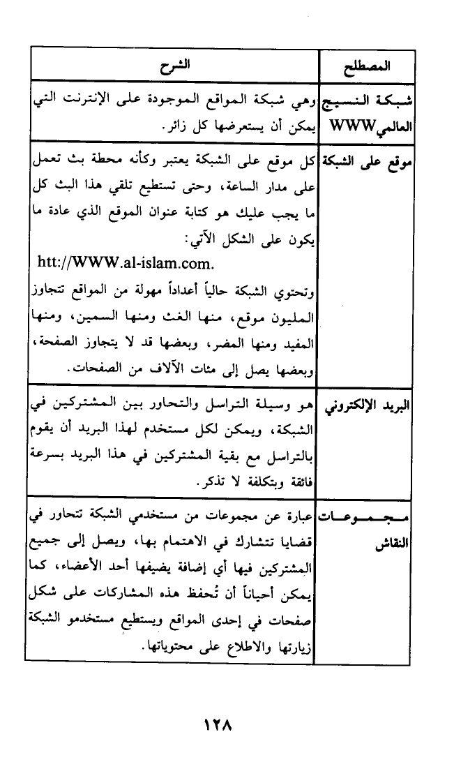 وتحتوي الشبكة حالياً أعداداً مهولة من المواقع تتجاوز المليون موقع، منها الغث ومنها السمين، ومنها المفيد ومنها المضر، وبعضها قد لا يتجاوز الصفحة، وبعضها يصل إلى مئات الآلاف من الصفحات. ... البريد الإلكتروني ... هو وسيلة التراسل والتحاور بين المشتركين في الشبكة، ويمكن لكل مستخدم لهذا البريد أن يقوم بالتراسل مع بقية المشتركين في هذا البريد بسرعة فائقة وبتكلفة لا تذكر.