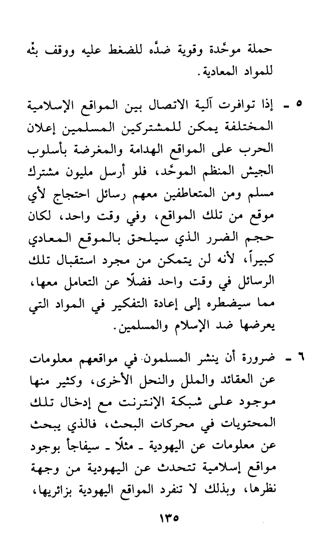 5 - إذا توافرت آلية الاتصال بين المواقع الإسلامية المختلفة يمكن للمشتركين المسلمين إعلان الحرب على المواقع الهدامة والمغرضة بأسلوب الجيش المنظم الموحَّد، فلو أرسل مليون مشترك مسلم ومن المتعاطفين معهم رسائل احتجاج لأي موقع من تلك المواقع، وفي وقت واحد، لكان حجم الضرر الذي سيلحق بالموقع المعادي كبيراً، لأنه لن يتمكن من مجرد استقبال تلك الرسائل في وقت واحد فضلاً عن التعامل معها، مما سيضطره إلى إعادة التفكير في المواد التي يعرضها ضد الإسلام والمسلمين.