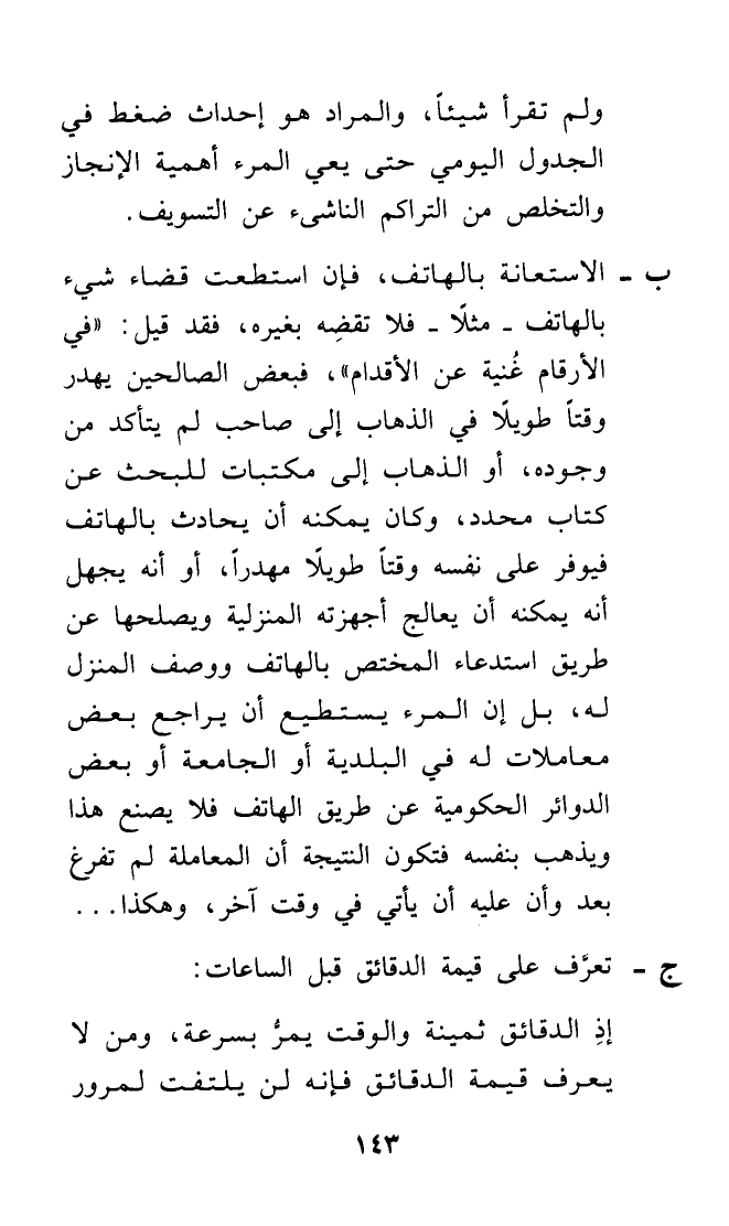 ب الاستعانة بالهاتف، فإن استطعت قضاء شيء بالهاتف - مثلاً - فلا تقضِه بغيره، فقد قيل: ((في الأرقام غُنية عن الأقدام))، فبعض الصالحين يهدر وقتاً طويلاً في الذهاب إلى صاحب لم يتأكد من وجوده، أو الذهاب إلى مكتبات للبحث عن كتاب محدد، وكان يمكنه أن يحادث بالهاتف فيوفر على نفسه وقتاً طويلاً مهدراً، أو أنه يجهل أنه يمكنه أن يعالج أجهزته المنزلية ويصلحها عن طريق استدعاء المختص بالهاتف ووصف المنزل له، بل إن المرء يستطيع أن يراجع بعض معاملات له في البلدية أو الجامعة أو بعض الدوائر الحكومية عن طريق الهاتف فلا يصنع هذا ويذهب بنفسه فتكون النتيجة أن المعاملة لم تفرغ بعد وأن عليه أن يأتي في وقت آخر، وهكذا ...