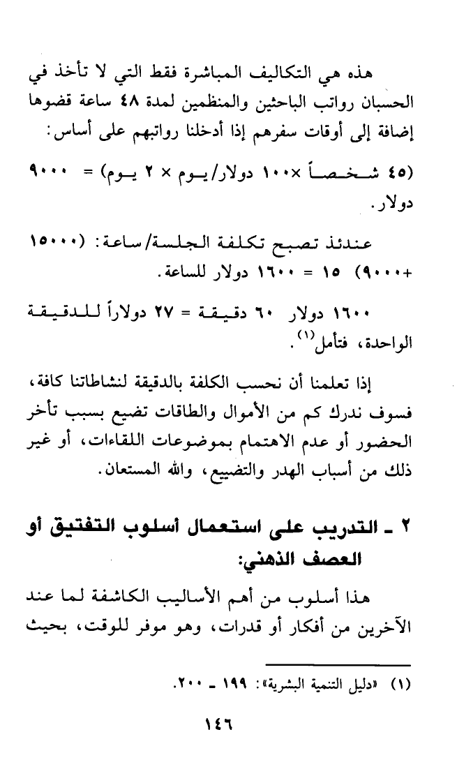 إذا تعلمنا أن نحسب الكلفة بالدقيقة لنشاطاتنا كافة، فسوف ندرك كم من الأموال والطاقات تضيع بسبب تأخر الحضور أو عدم الاهتمام بموضوعات اللقاءات، أو غير ذلك من أسباب الهدر والتضييع، والله المستعان.