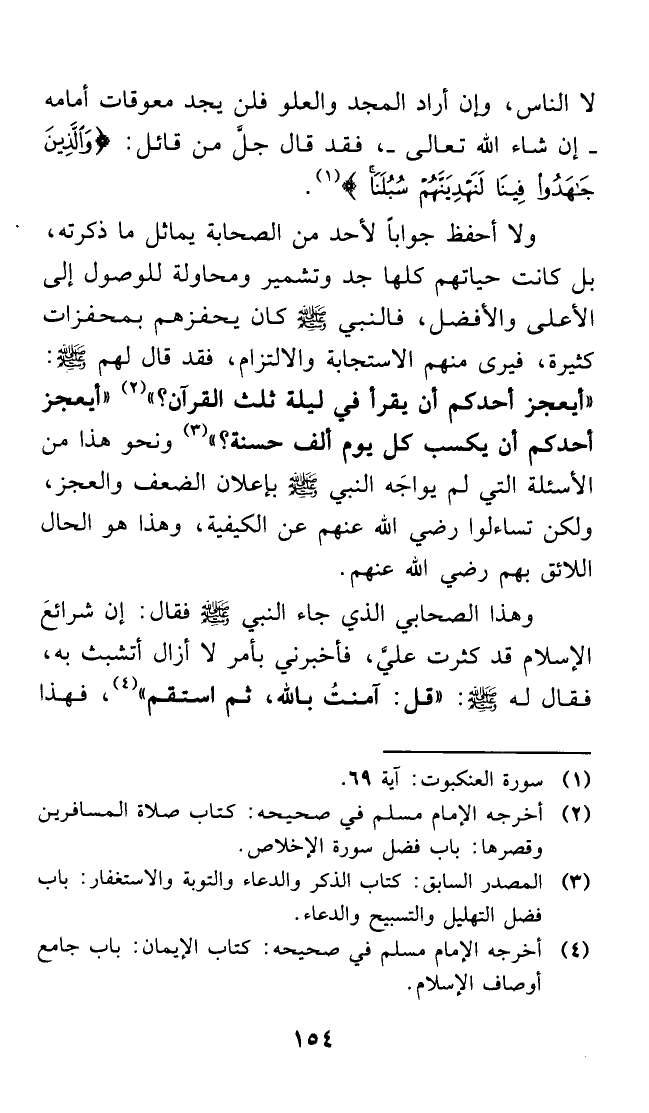 ولا أحفظ جواباً لأحد من الصحابة يماثل ما ذكرته، بل كانت حياتهم كلها جد وتشمير ومحاولة للوصول إلى الأعلى والأفضل، فالنبي - صلى الله عليه وسلم - كان يحفزهم بمحفزات كثيرة، فيرى منهم الاستجابة والالتزام، فقد قال لهم - صلى الله عليه وسلم -: ((أيعجز أحدكم أن يقرأ في ليلة ثلث القرآن؟)) (¬2) ((أيعجز أحدكم أن يكسب كل يوم ألف حسنة؟)) (¬3) ونحو هذا من الأسئلة التي لم يواجَه النبي - صلى الله عليه وسلم - بإعلان الضعف والعجز، ولكن تساءلوا رضي الله عنهم عن الكيفية، وهذا هو الحال اللائق بهم رضي الله عنهم.