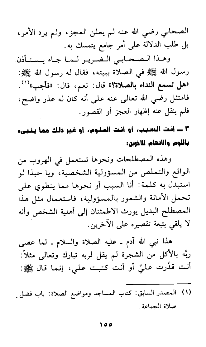 هذا نبي الله آدم - عليه الصلاة والسلام - لما عصى ربَّه بالأكل من الشجرة لم يقل لربه تبارك وتعالى مثلاً: أنت قدَّرت عليَّ أو أنت كتبت علي، إنما قال - صلى الله عليه وسلم -: