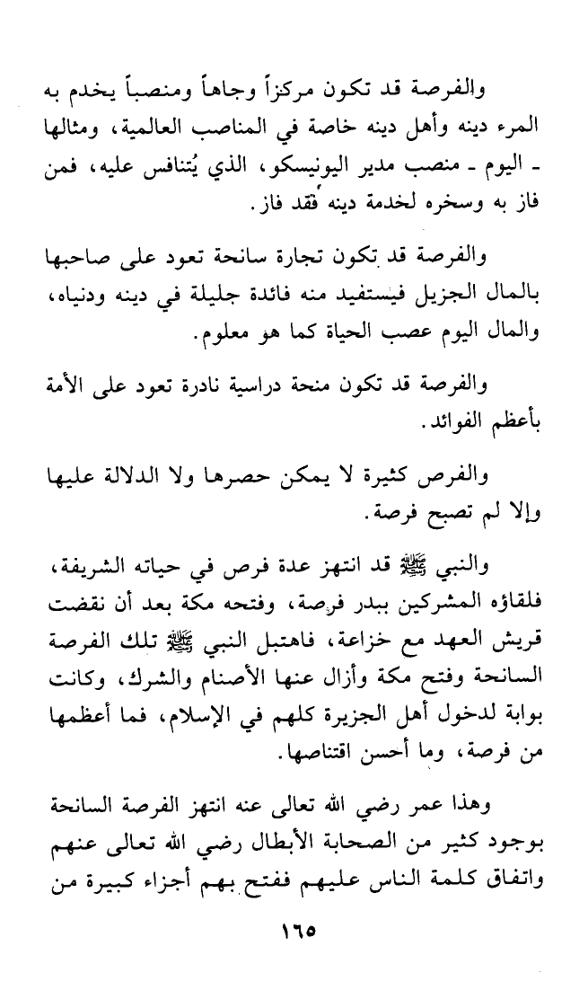 والنبي - صلى الله عليه وسلم - قد انتهز عدة فرص في حياته الشريفة، فلقاؤه المشركين ببدر فرصة، وفتحه مكة بعد أن نقضت قريش العهد مع خزاعة، فاهتبل النبي - صلى الله عليه وسلم - تلك الفرصة السانحة وفتح مكة وأزال عنها الأصنام والشرك، وكانت بوابة لدخول أهل الجزيرة كلهم في الإسلام، فما أعظمها من فرصة، وما أحسن اقتناصها.