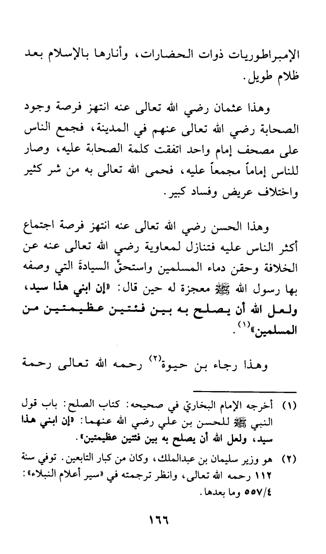 وهذا الحسن رضي الله تعالى عنه انتهز فرصة اجتماع أكثر الناس عليه فتنازل لمعاوية رضي الله تعالى عنه عن الخلافة وحقن دماء المسلمين واستحقَّ السيادةَ التي وصفه بها رسول الله - صلى الله عليه وسلم - معجزة له حين قال: ((إن ابني هذا سيد، ولعل الله أن يصلح به بين فئتين عظيمتين من المسلمين)) (¬1).