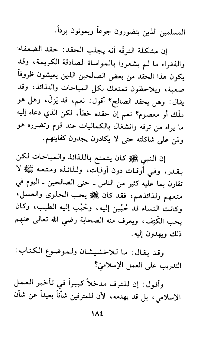 وأقول: إن للترف مدخلاً كبيراً في تأخير العمل الإسلامي، بل قد يهدمه، لأن للمترفين شأناً بعيداً عن شأن