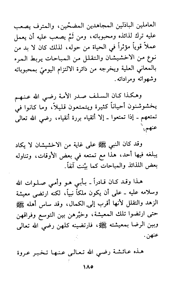 العاملين الباذلين المجاهدين المضحِّين، والمترف يصعب عليه ترك لذائذه ومحبوباته، ومن ثَمَّ يصعب عليه أ، يعمل عملاً قوياً مؤثراً في الحياة من حوله، لذلك كان لابد من نوع من الاخشيشان والتقلل من المباحث يربط المرء بالمعاني العلية ويخرجه من دائرة الالتزام اليوميّ بمحبوباته وشهواته ومراداته.