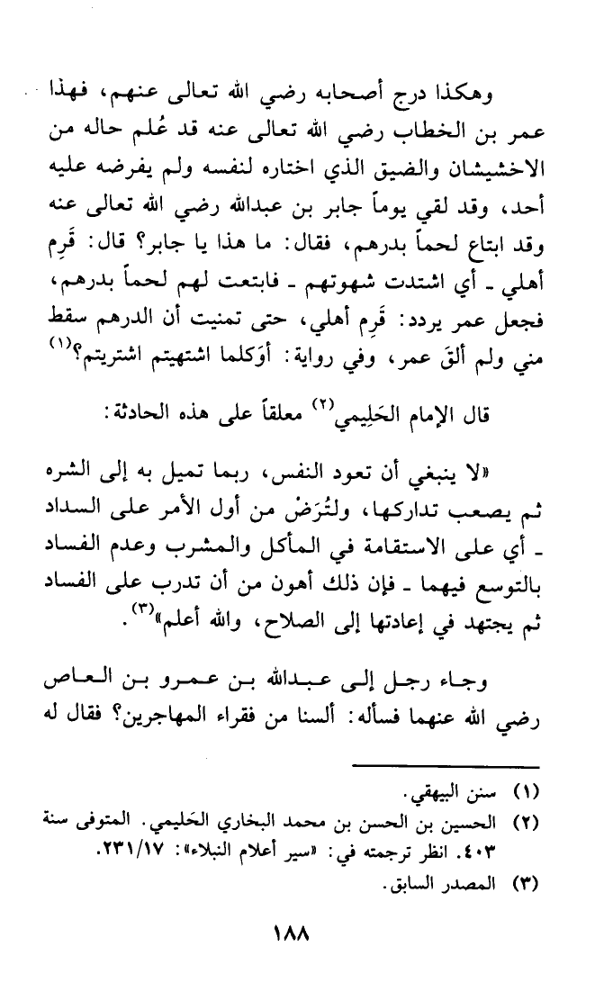وهكذا درج أصحابه رضي الله تعلى عنهم، فهذا عمر بن الخطاب رضي الله تعالى عنه قد عُلم حاله من الاخشيشان والضيق الذي اختاره لنفسه ولم يفرضه عليه أحد، وقد لقي يوماً جابر بن عبد الله رضي الله تعالى عنه وقد ابتاع لحماً بدرهم، فقال: ما هذا ياجابر؟ قال: قَرِم أهلي - أي اشتدت شهوتهم - فابتعت لهم لحماً بدرهم، فجعل عمر يردد: قَرِم أهلي، حتى تمنيت أن الدرهم سقط مني ولم ألقَ عمر، وفي رواية: أوَكلما اشتهيتم اشتريتم؟ (¬1)