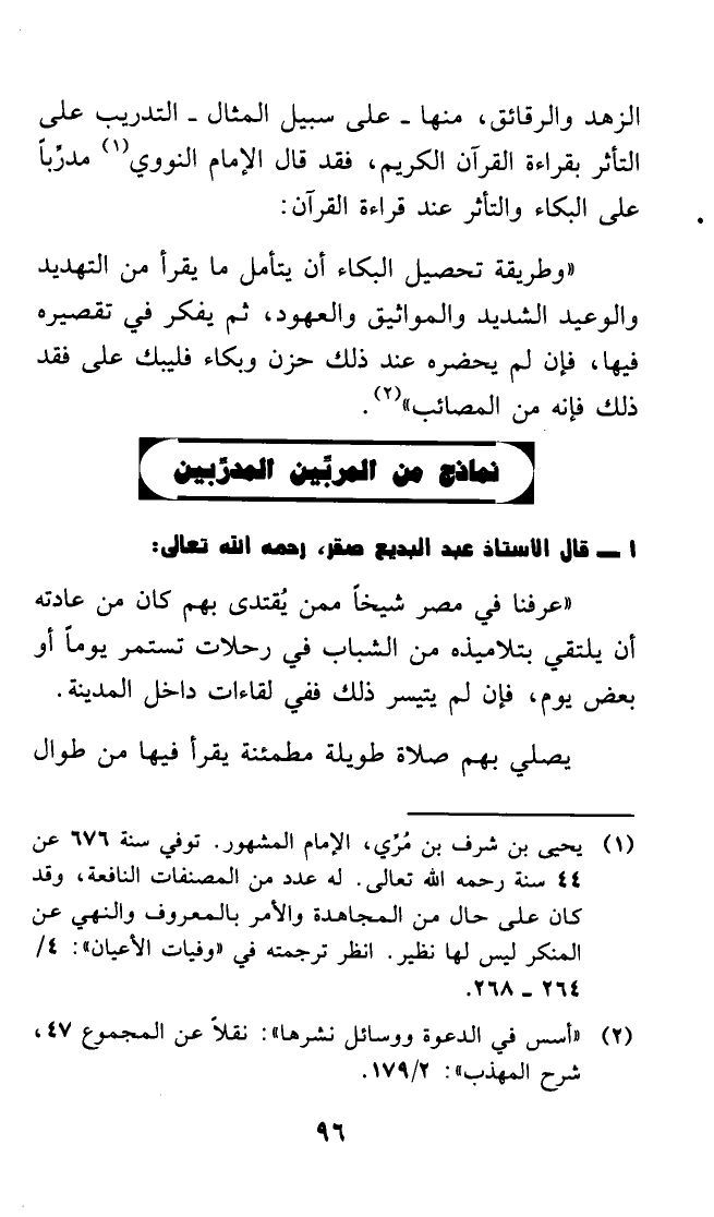 الزهد والرقائق، منها - على سبيل المثال -التدريب على التأثر بقراءة القرآن الكريم، فقد قال الإمام النووي (¬1) مدرباً على البكاء والتأثر عند قراءة القرآن: