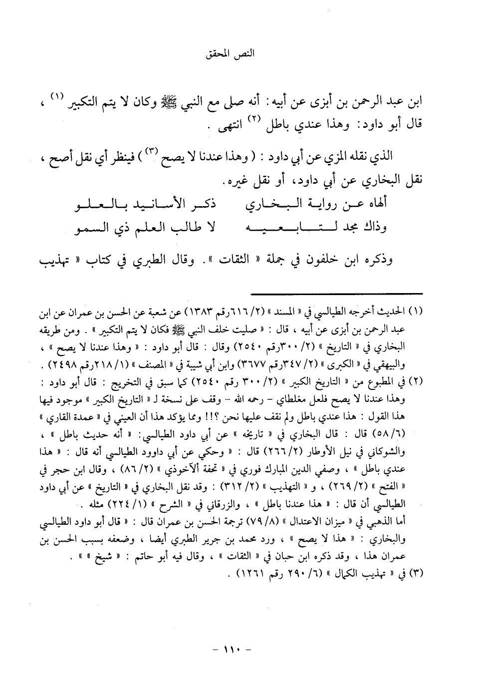 (¬٢) في المطبوع من "التاريخ الكبير" (٢/ ٣٠٠ رقم ٢٥٤٠) كما سبق قي التخريج: قال أبو داود: وهذا عندنا لا يصح فلعل مغلطاي -رحمه الله- وقف على نسخة لـ "التاريخ الكبير" موجود فيها هذا القول: هذا عندي باطل ولم نقف عليها نحن؟!! ومما يؤكد هذا أن العيني في "عمدة القاري" (٦/ ٥٨) قال: قال البخاري في "تاريخه" عن أبي داود الطيالسي: "أنه حديث باطل"، والشوكاني في نيل الأوطار (٢/ ٢٦٦) قال: "وحكي عن أبي داوود الطيالسي أنه قال: "هذا عندي باطل"، وصفي الدين المبارك فوري في "تحفة ألآخوذي" (٢/ ٨٦)، وقال ابن حجر في "الفتح" (٢/ ٢٦٩)، و"التهذيب" (٢/ ٣١٢):وقد نقل البخاري في "التاريخ" عن أبي داود الطيالسي أن قال: "هذا عندنا باطل"، والزرقاني في "الشرح" (١/ ٢٢٤) مثله.