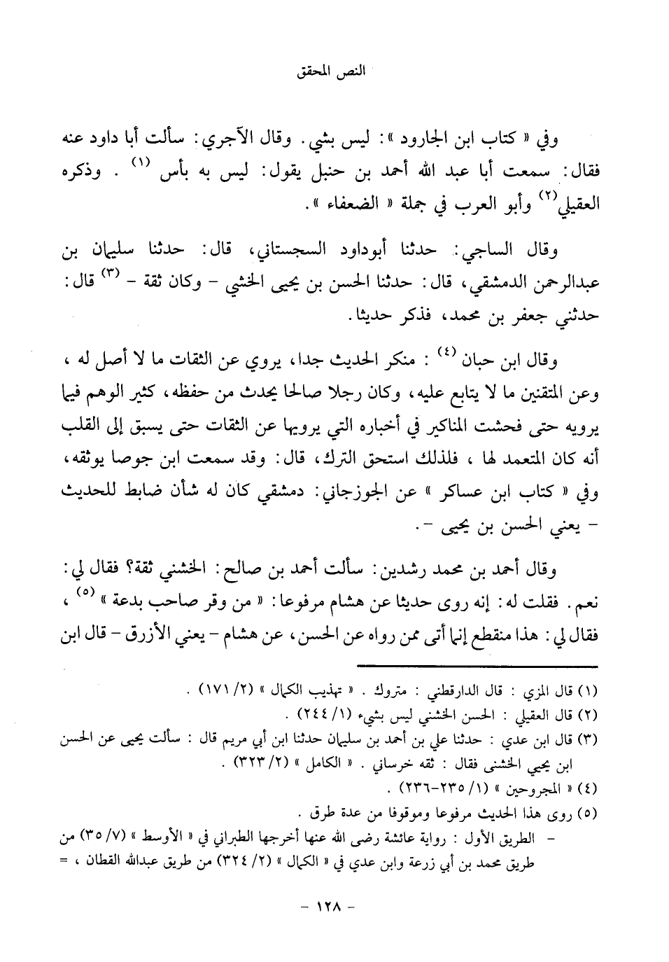 (¬٢) قال العقيلي: الحسن الخشني ليس بشيء (١/ ٢٤٤).