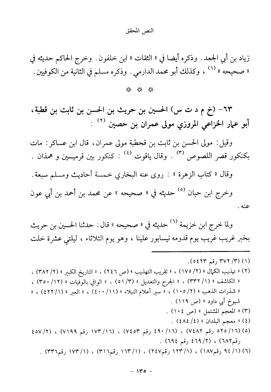 ٦٣ - (خ م د ت س) الحسين بن حريث بن الحسن بن ثابت بن قطبة، أبو عمار الخزاعي المروزي مولى عمران بن حصين (¬٢):